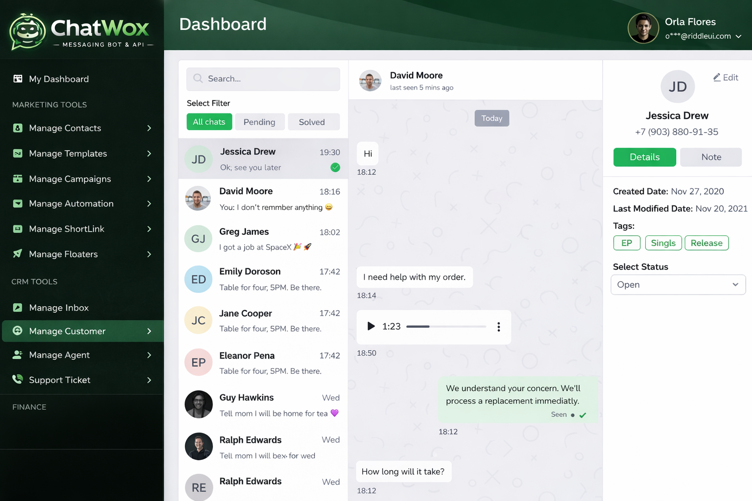 ChatWox is a complete cross-platform WhatsApp CRM and marketing tool that helps businesses manage conversations, automate customer engagement, and run marketing campaigns through WhatsApp.